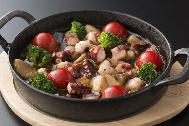 オリーブ油とにんにくで具材を煮込むアヒージョは、たこのぷりぷりとした食感によく合います。バゲットを添えて、うま味と香りが溶けこんだオイルまでいただきましょう。オイルが残ったときはパスタにからめるて食べるのもおすすめ。